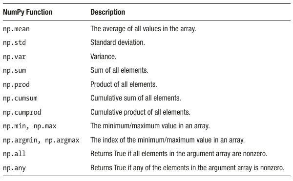 By default, the functions in the above Table aggregate over the entire input array. Using the axis keyword argument with these functions, and their corresponding ndarray methods, it is possible to control over which axis in the array aggregation is carried out. The axis argument can be an integer, which specifies the axis to aggregate values over. In many cases the axis argument can also be a tuple of integers, which specifies multiple axes to aggregate over.