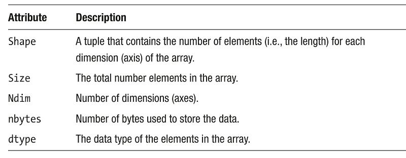 The “shape” of this array is a tuple with the number of elements per axis (dimension). In our example, the shape is equal to (6, 3), i.e. we have 6 lines and 3 columns.