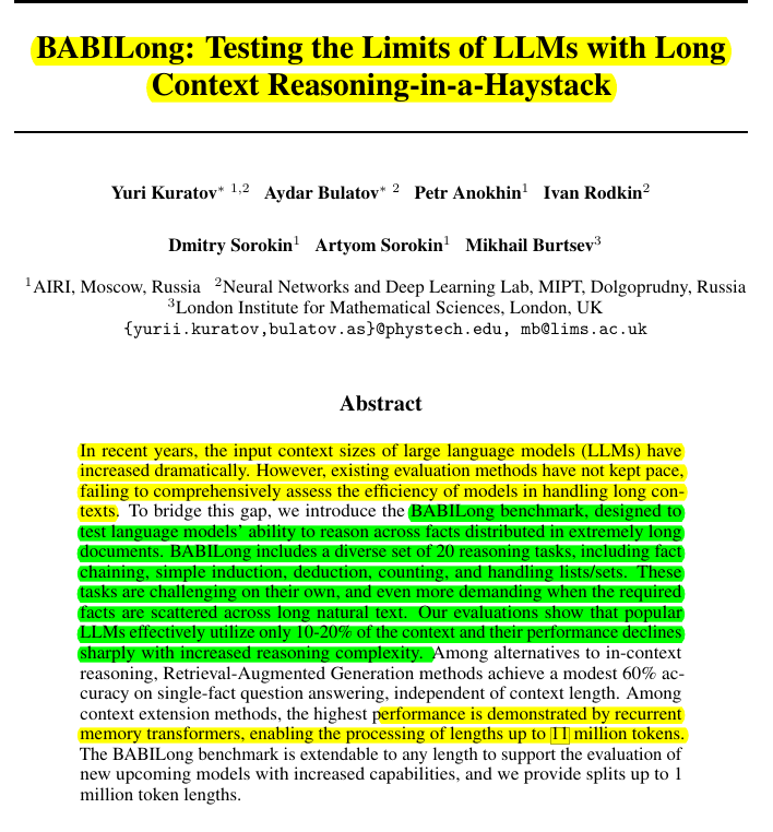 BABILong shows popular LLMs only use 10-20% of their advertised context window effectively