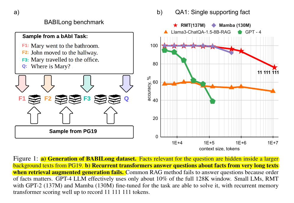 • Introduces BABILong benchmark with 20 reasoning tasks testing fact-chaining, induction, deduction, counting