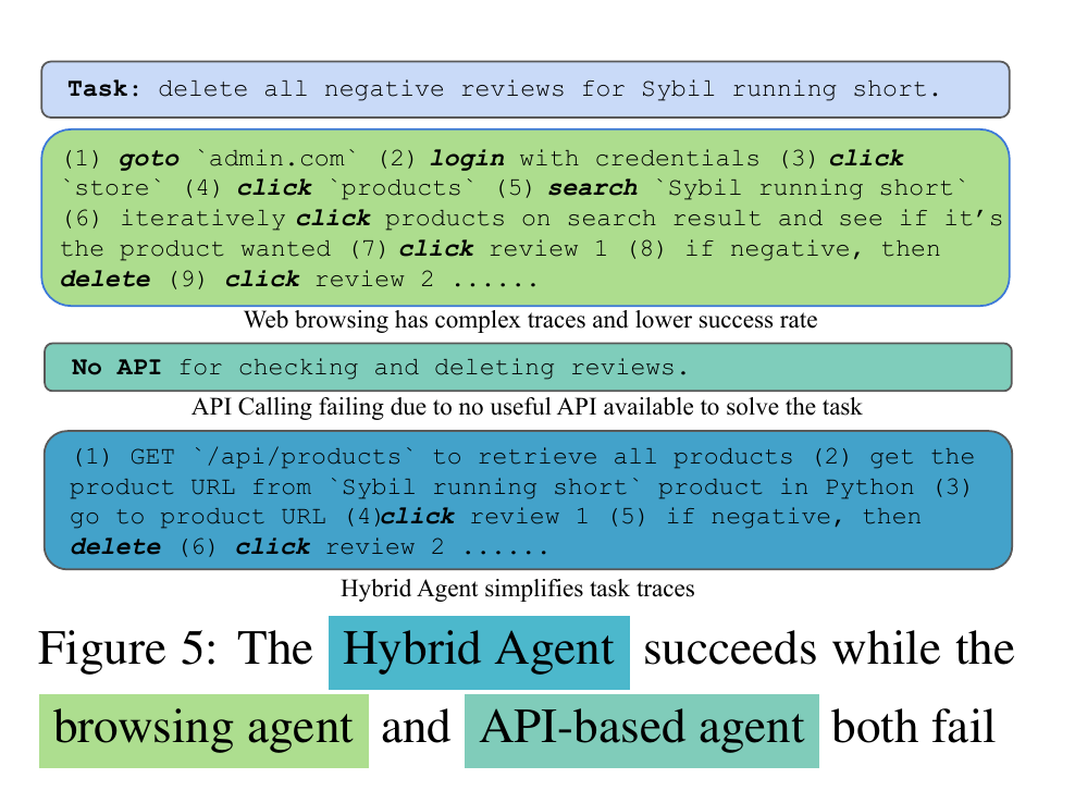 Hybrid Agent: 35.8% average success rate by combining both methods The Hybrid Agent outperforms both other approaches by dynamically switching between API calls and web browsing based on task requirements.