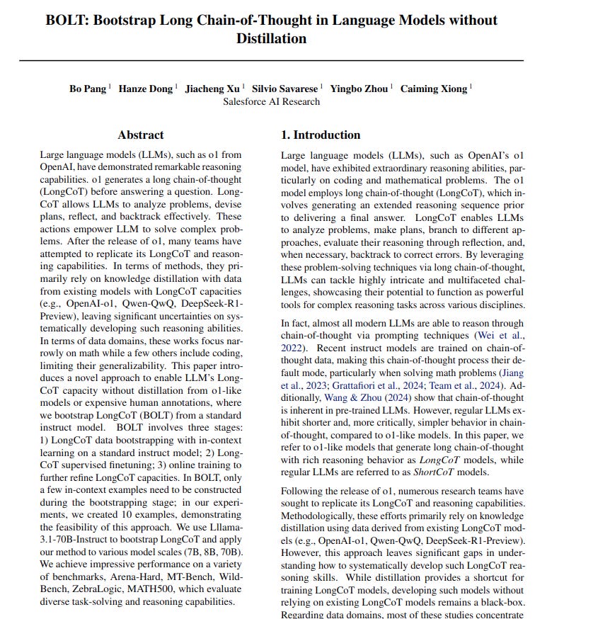 This paper introduces BOLT. It bootstraps LongCoT capacity in standard instruct models. It avoids distillation through a three-stage process.