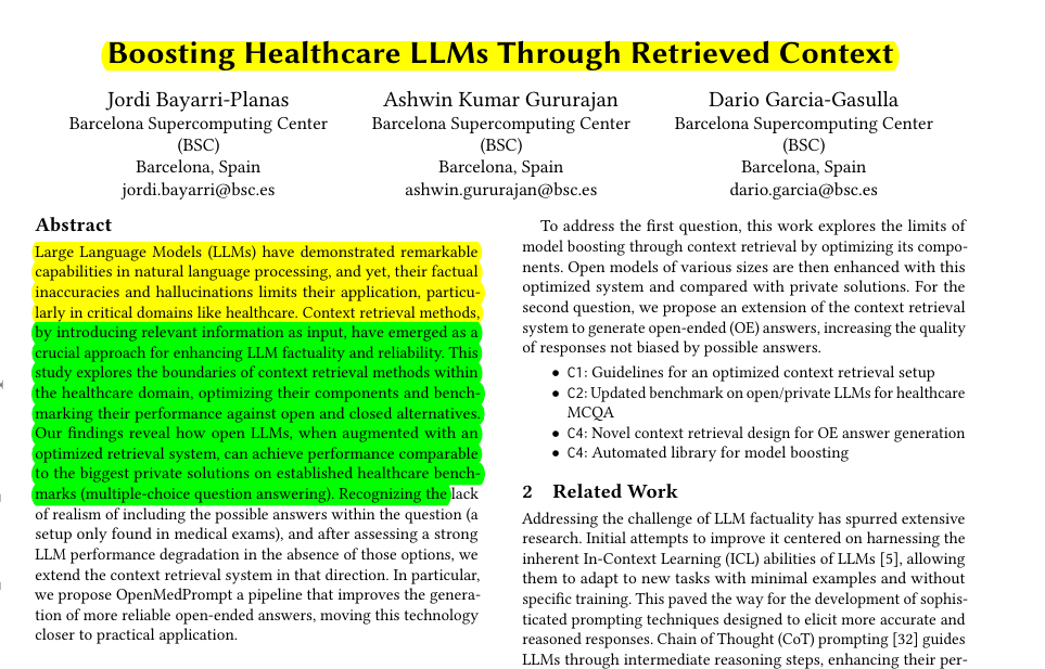 The main objective of this research is to explore the boundaries of context retrieval methods within the healthcare domain, optimizing their components and benchmarking their performance against open and closed alternatives. The approach involves enhancing Large Language Models (LLMs) with optimized context retrieval systems to improve their factual accuracy and reliability in medical question answering tasks.