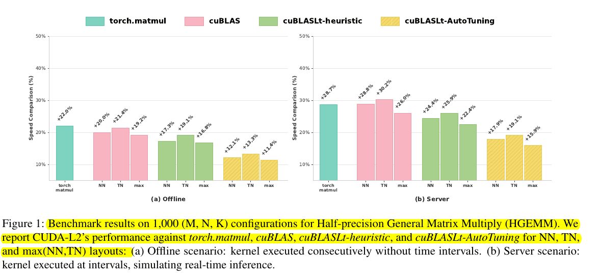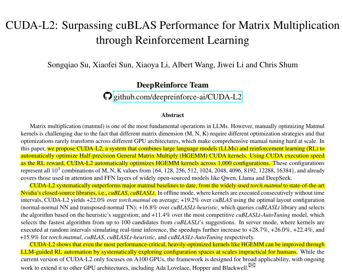 Their proposed CUDA-L2 fully automatically writes GPU code for matrix multiplication that runs about 10%–30% faster than NVIDIA’s already-optimized cuBLAS/cuBLASLt library. They also have released the full code on Github.