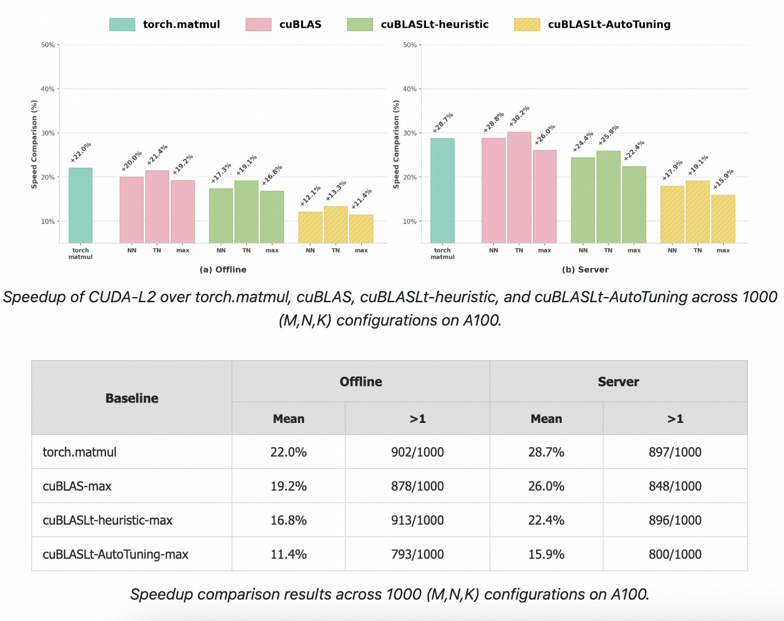 In the offline case on the left, CUDA-L2 is roughly 17% to 22% faster than torch.matmul, cuBLAS, and cuBLASLt, and still about 11% faster than cuBLASLt AutoTuning even though that baseline already runs its own kernel search.