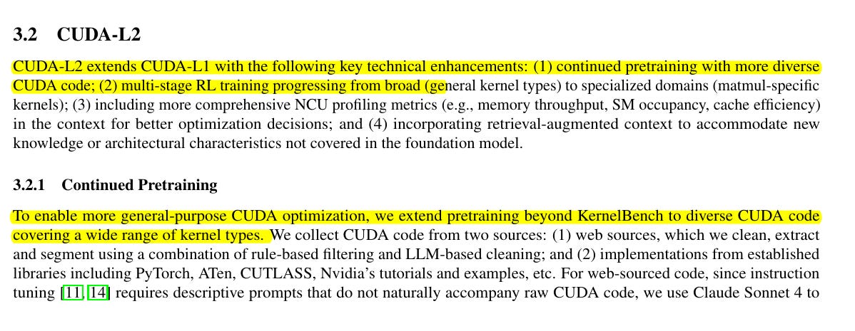 CUDA-L2 starts from a strong base model, DeepSeek 671B, and continues pretraining it on a large collection of CUDA kernels drawn from the web plus high quality library code from PyTorch, ATen, CUTLASS, and NVIDIA examples, so the model sees many real patterns for tiling, memory movement, and tensor core usage.