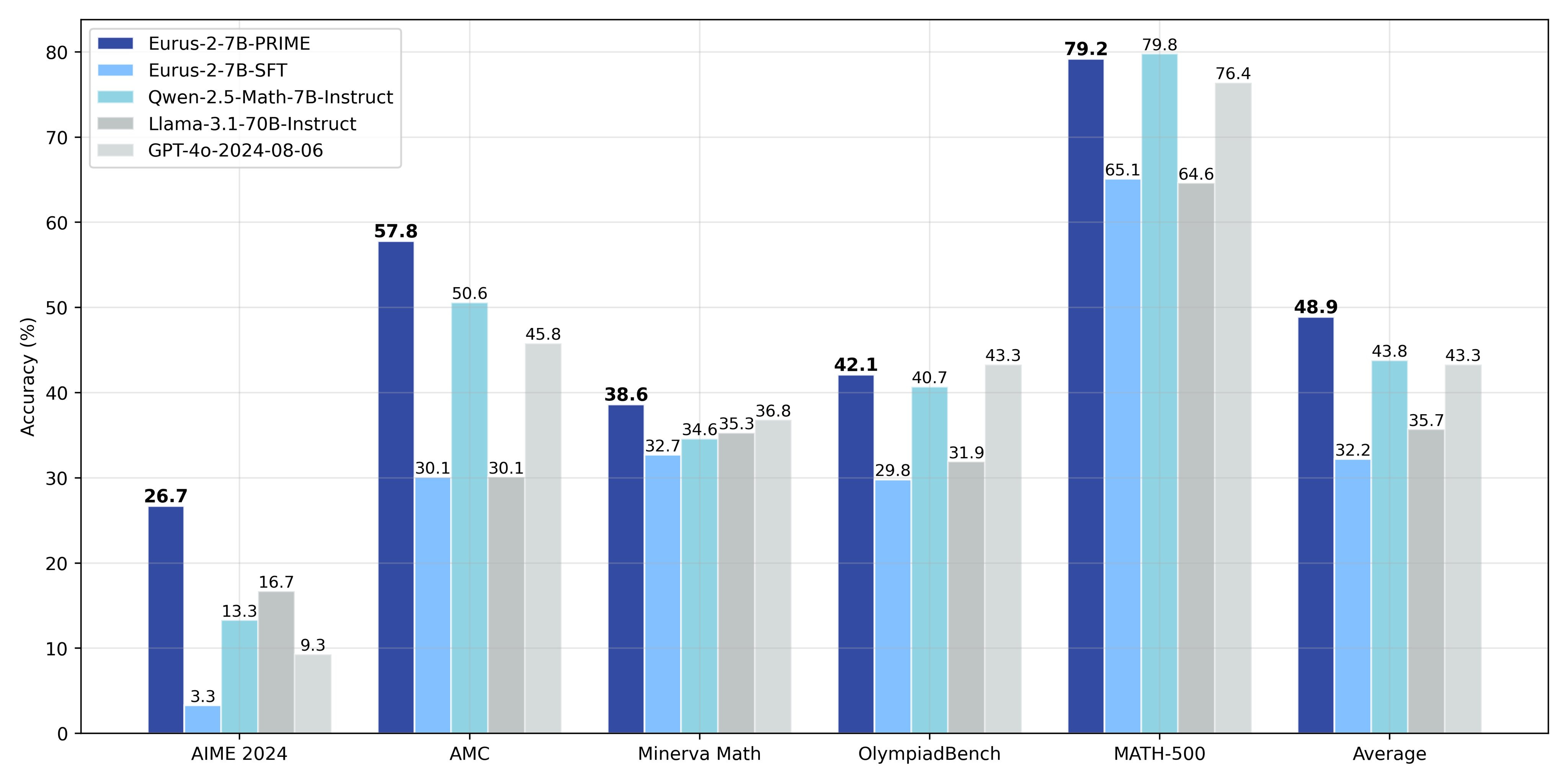 → Implementation combines RLOO ( "Reinforcement Learning Leave-One-Out"), for advantage estimation with PPO policy updates, demonstrating 16.7% average improvement over supervised fine-tuning. The model, Eurus-2-7B-PRIME, achieves strong performance across mathematical reasoning benchmarks with only 230K SFT and 150K RL training examples.