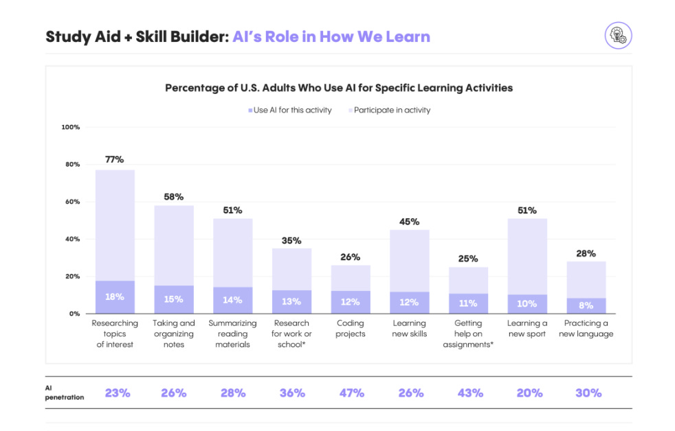 Personal coding projects and help on assignments are the highest penetration use cases for learning