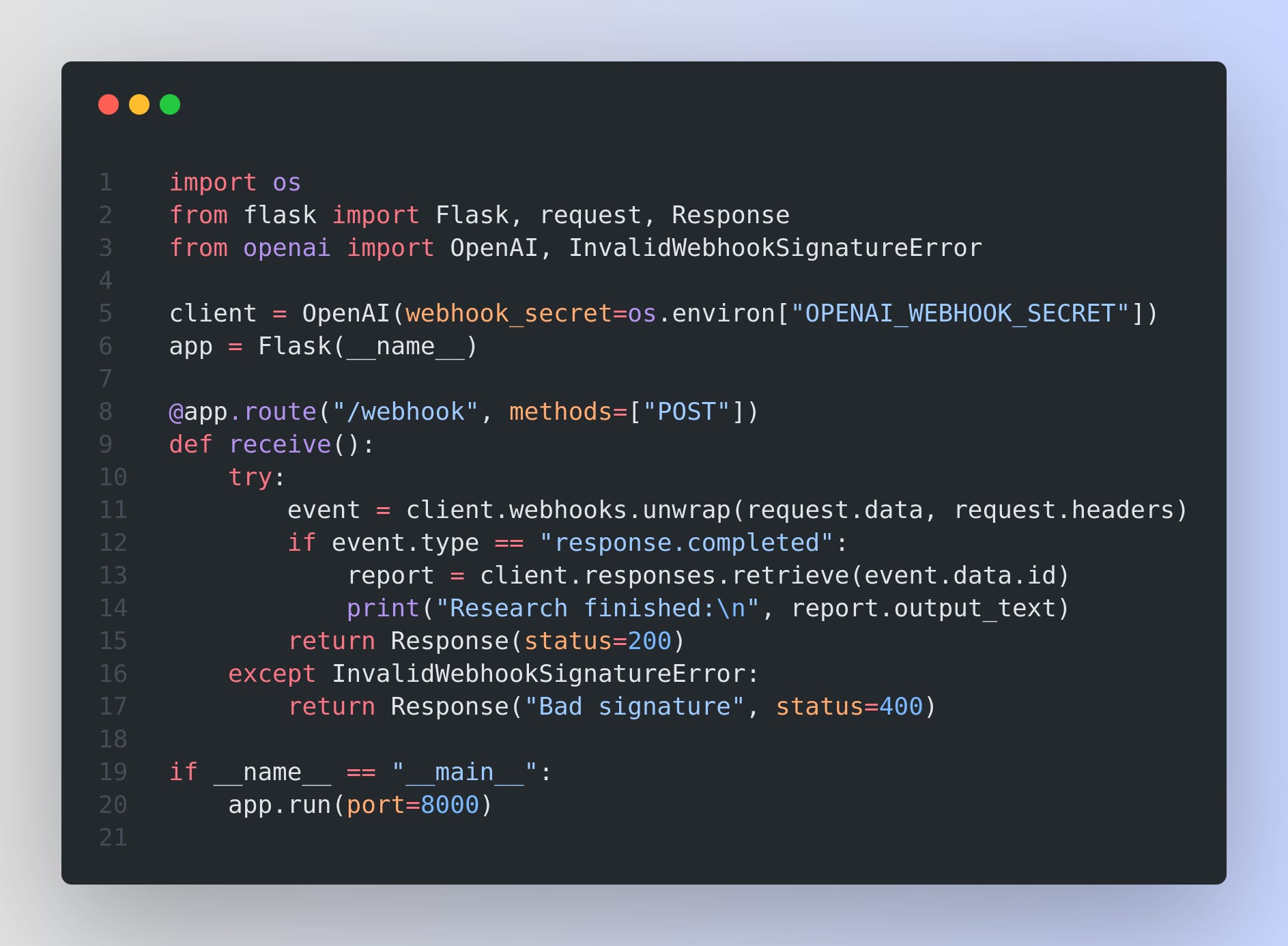 Deep Research can run for minutes. Background mode frees your client immediately – and that’s where webhooks shine.