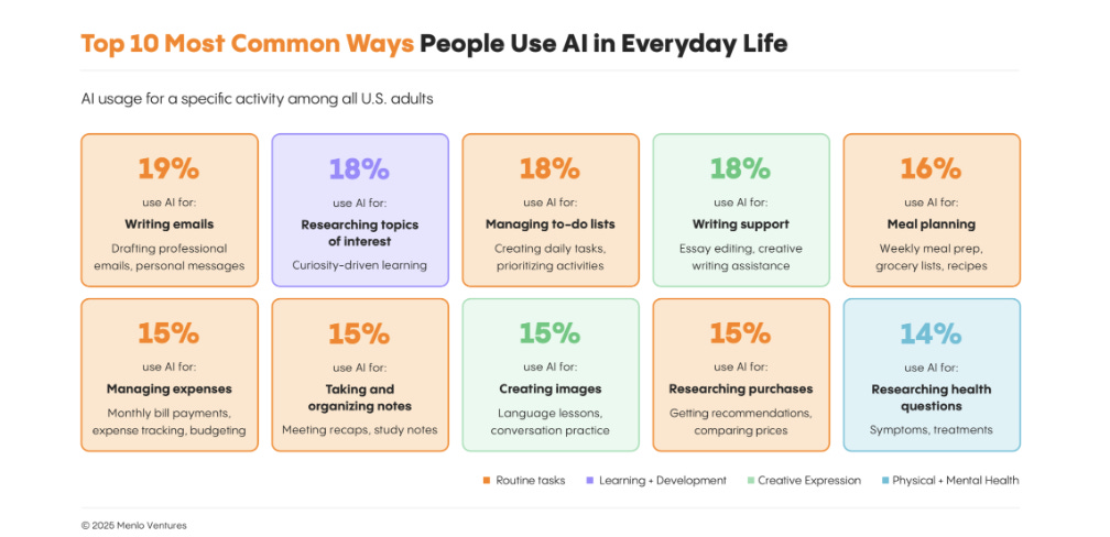 🛠️ Breadth beats depth in current workflows: People lean on AI for quick email drafts, to-do lists, and simple research, yet no single task sees more than 1 in 5 users rely on it end-to-end. They still handle bills, health queries, and home repairs without AI, exposing where value stays locked.