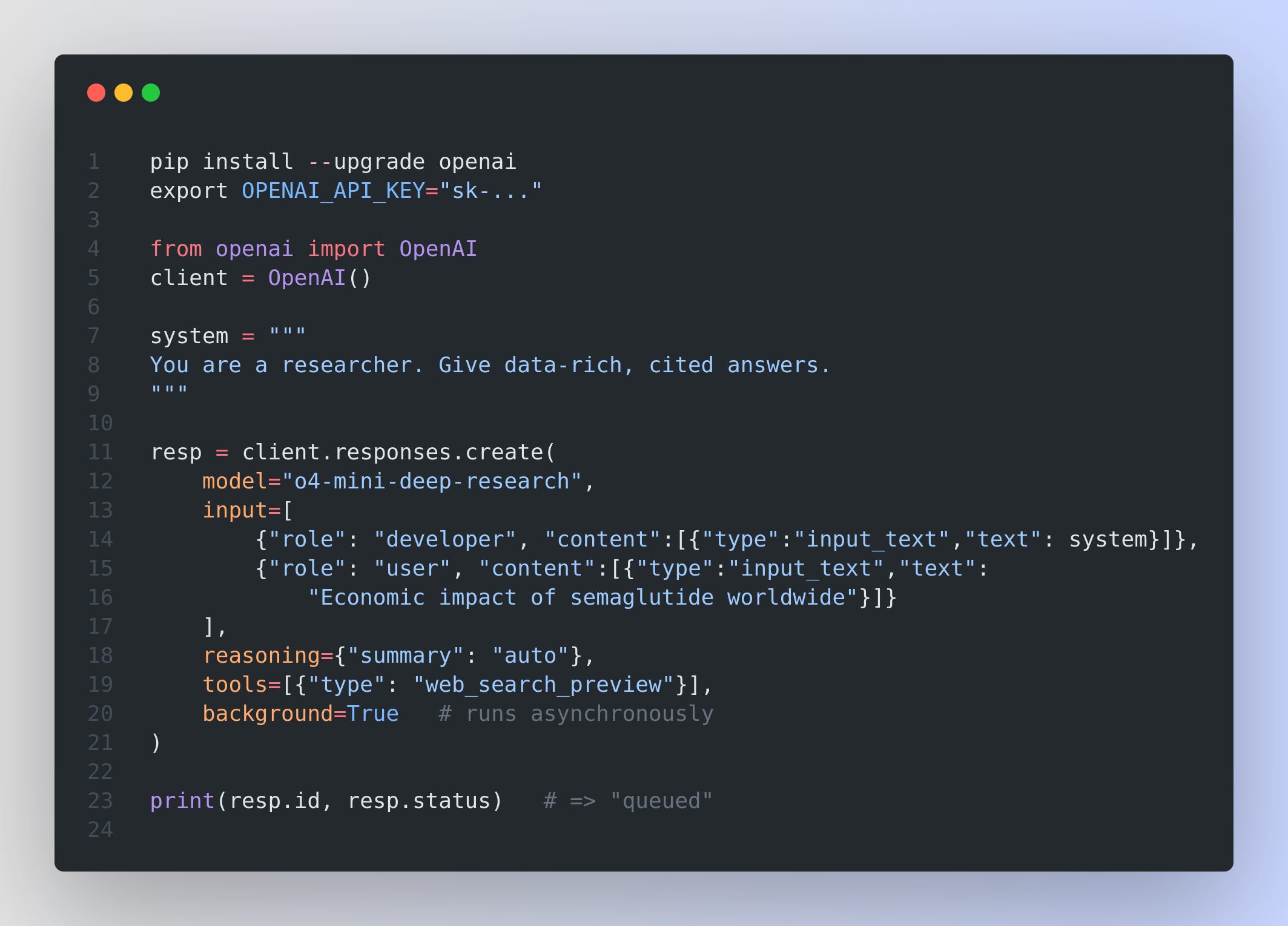 Deep Research API – lets the model plan searches, run them, crunch numbers, and hand you a fully-cited report.
