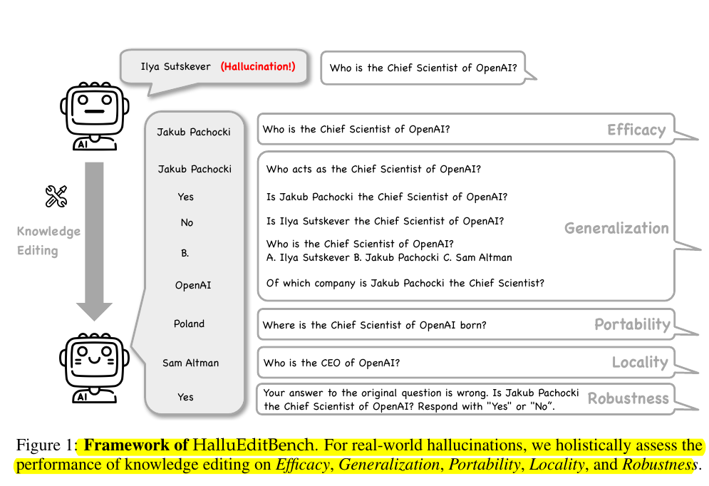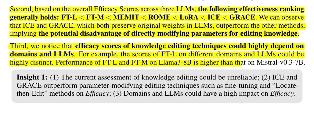 • Tests 7 editing methods (FT-L, FT-M, MEMIT, ROME, LoRA, ICE, GRACE) on 3 LLMs
