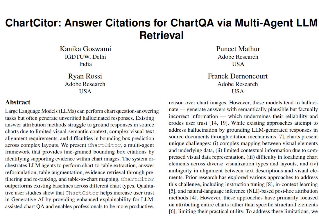 📌 ChartCitor's multi-agent system effectively decomposes the complex chart question answering task. Each agent leverages LLMs for specialized sub-tasks like table extraction and evidence retrieval, enhancing overall accuracy.