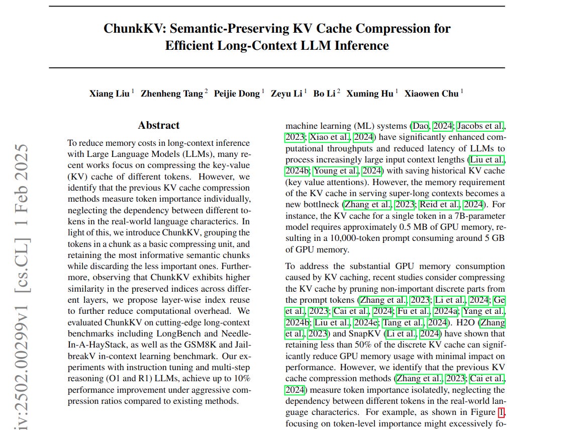 📌 ChunkKV innovatively addresses semantic loss in KV cache compression by operating at chunk level. This ensures subject-predicate-object relationships are retained, unlike token-isolated methods, leading to better long-context task performance.