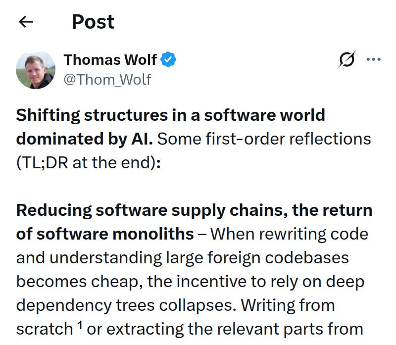 🗞️ Thomas Wolf, Huggingface founder writes a viral piece on Twitter - The biggest change AI brings to programming is not faster coding, it is cheaper replacement of everything you thought was “too entrenched to touch.”