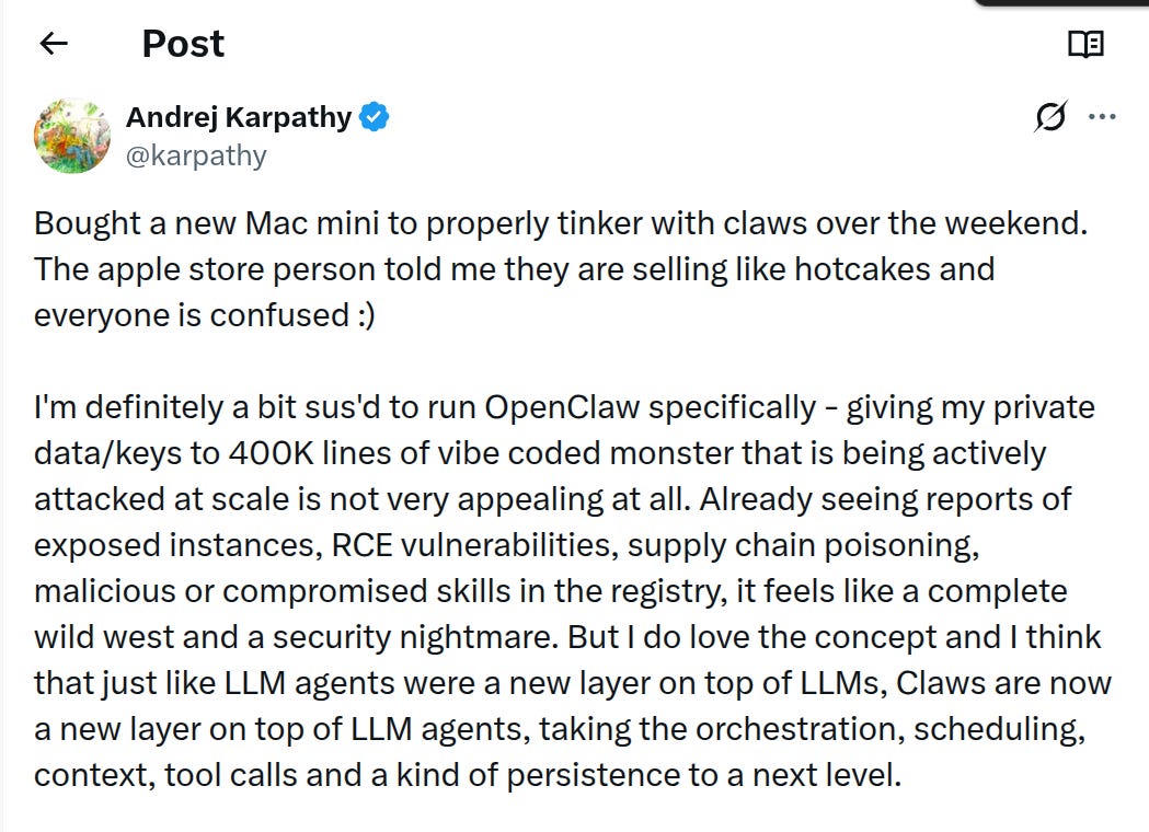 🗞️ Andrej Karpathy also posted a viral post on how Claws turn agents into orchestrators, and containers look like the basic safety belt.