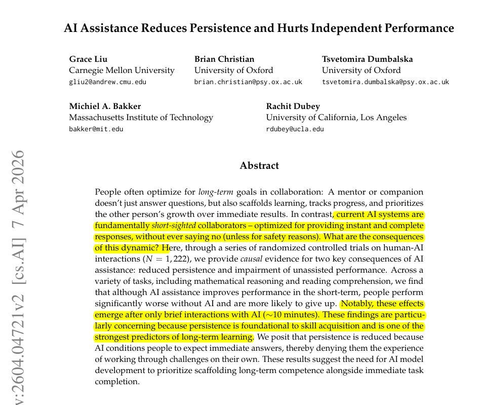 Just minutes of AI help can improve scores now while weakening independent problem-solving right after.