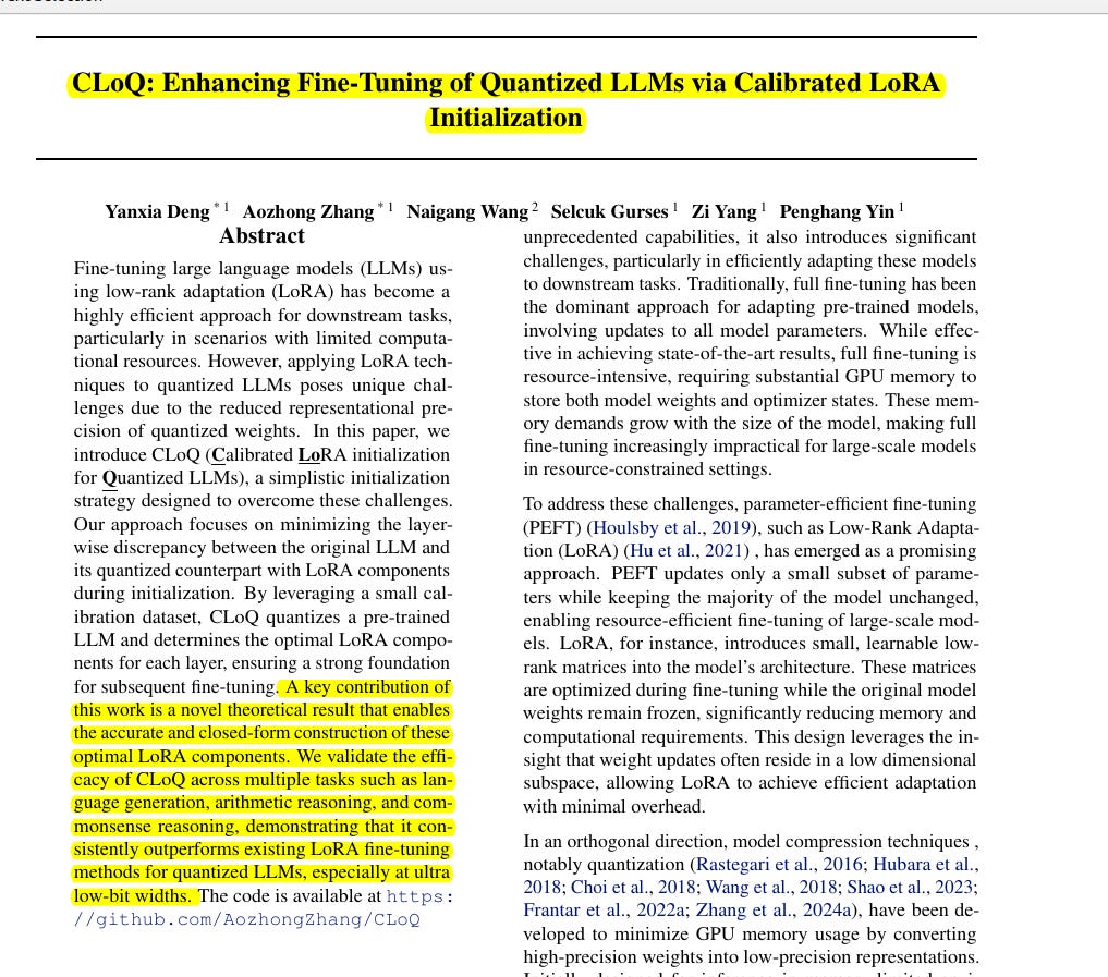 → The paper proposes CLoQ, Calibrated LoRA initialization for Quantized LLMs.