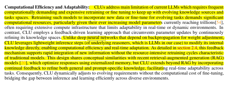 Unlike neural networks that update weights through backpropagation, CLUs refine knowledge representations in their GKS and PKS. This approach allows for: