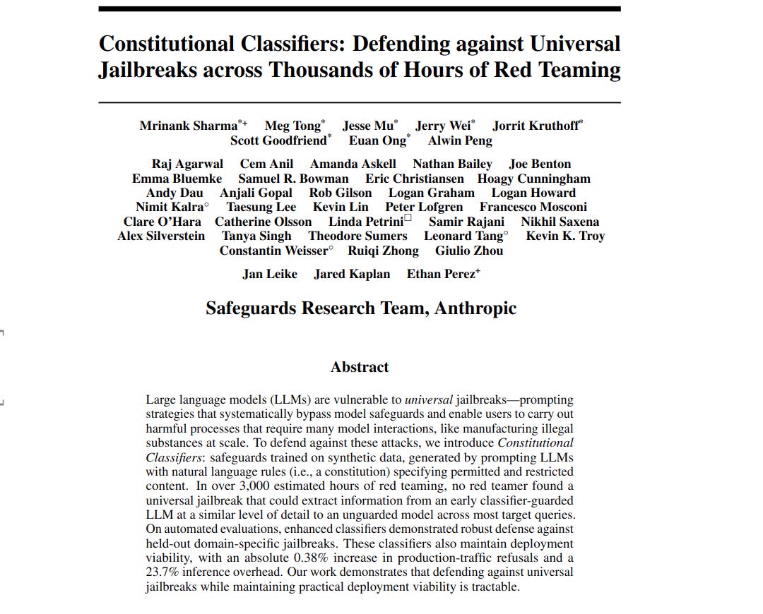 "Constitutional Classifiers: Defending against Universal Jailbreaks across Thousands of Hours of Red Teaming"
