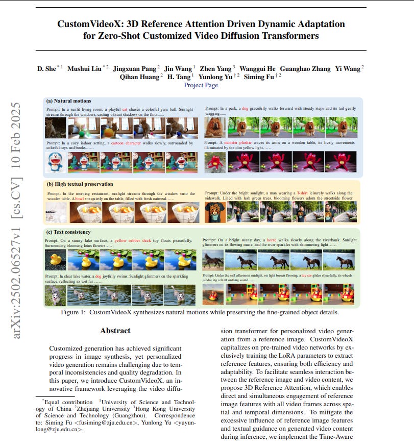 Personalized video generation faces challenges in maintaining consistent subject identity and temporal coherence across video frames. This paper introduces CustomVideoX to solve these problems by dynamically adapting a video diffusion transformer using a 3D reference attention mechanism.