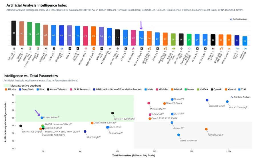 🏆 Great performance by China’s GLM-4.7-Flash (Reasoning) - the most intelligent open weights model under 100B total parameters
