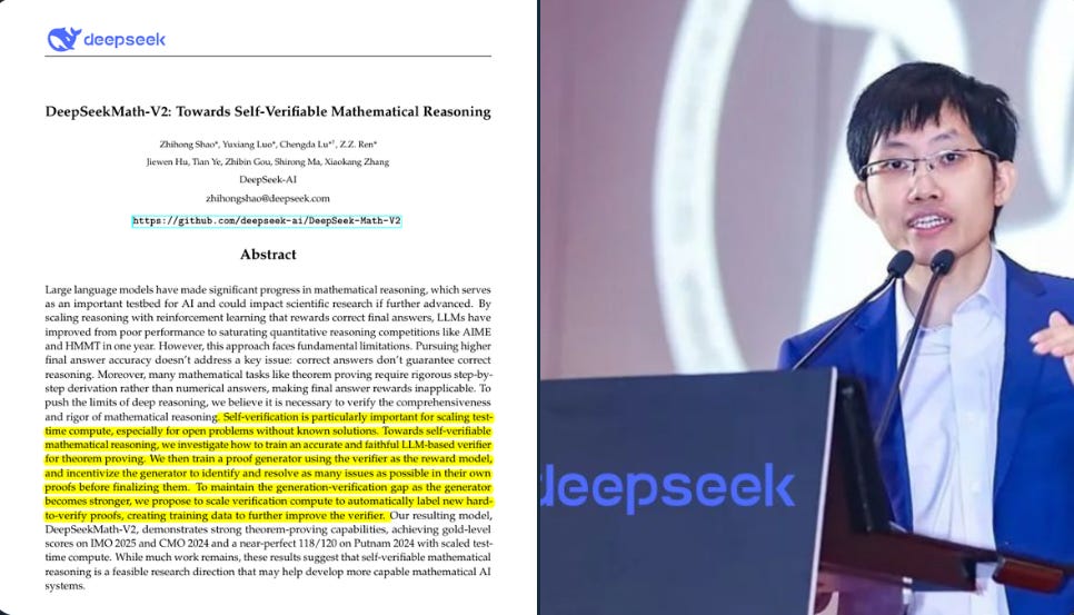 Fantastic breakdown of this week's developments. The DeepSeekMath-V2 approach is particularly clever because it addresses something overlooked in most math training: a correct final answer can hide completely broken reasoning. The three-tier scoring system (0, 0.5, 1) for proof rigor rather than just answer matching is a subtle but powerful shift. One question this raises is whether the verifier and meta-verifier architecture generalizes to domains where ground truth is harder to define than in formal mathematics. In theorem proving there's a clear notion of valid vs invalid steps, but applying this toproof-like reasoning in say legal or policy arguments could hit interesting definitional walls.