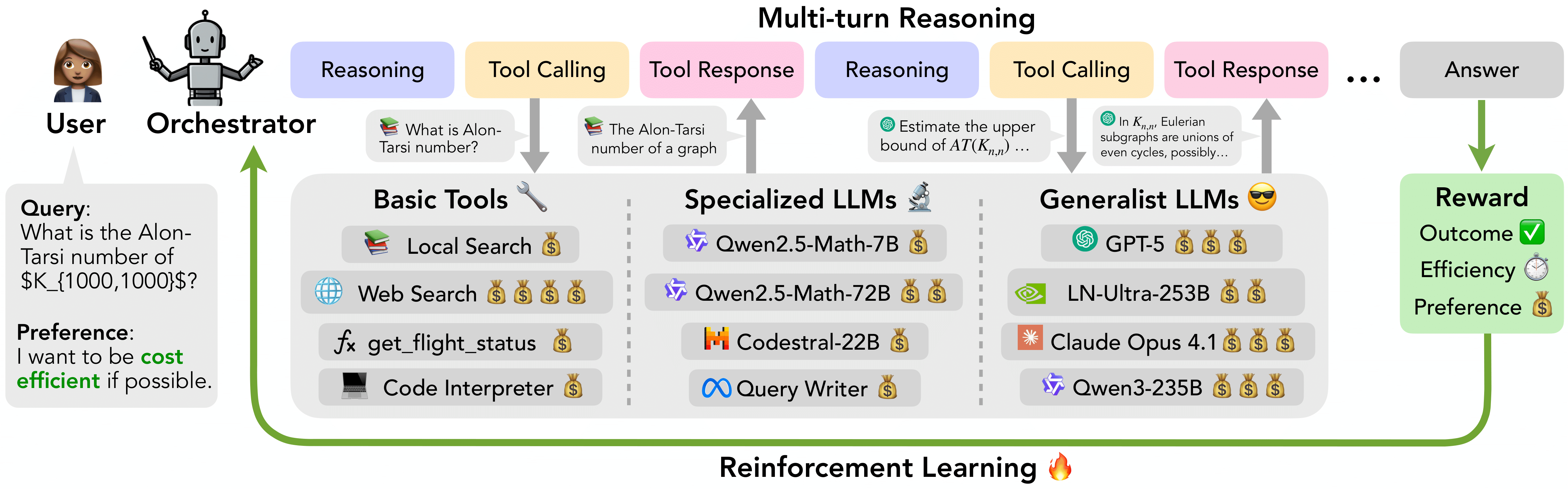 Instead of 1 giant LLM, Orchestrator-8B decides whether to respond itself or call tools like search, code, APIs, or other LLMs, and Group Relative Policy Optimization teaches a policy that balances accuracy, speed, cost, and user preferences.