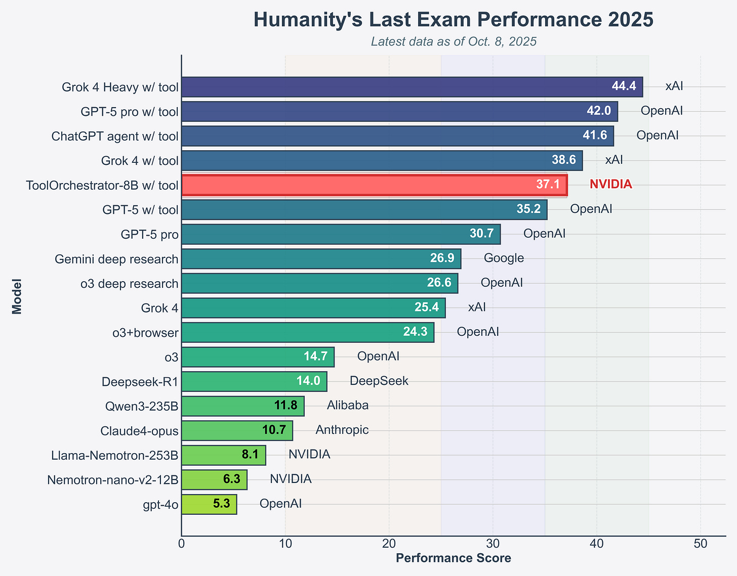 “On the Humanity’s Last Exam (HLE) benchmark, ToolOrchestrator-8B achieves a score of 37.1%, outperforming GPT-5 (35.1%) while being approximately 2.5x more efficient.”