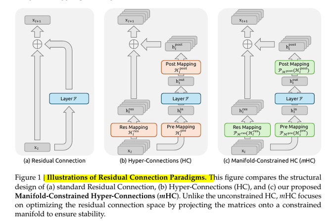 The left panel is the normal residual connection, where the model adds the layer output back to the original input so training stays steady as depth grows. The middle panel is Hyper-Connections, where the model keeps several parallel shortcut streams and learns how to mix them before the layer, around the layer, and after the layer, which can help quality but can also make the shortcut accidentally amplify or shrink signals when many layers stack. The right panel is mHC, which keeps the same Hyper-Connections idea but forces those mixing steps to stay in a constrained safe shape every time, so the shortcut behaves like a controlled blend and stays stable at large scale.
