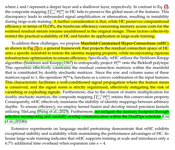 With the traditional the n-stream Hyper-Connections methods, residual design increases per-token memory access roughly proportional to n, increases activation memory needed for backprop, and even multiplies pipeline-parallel communication costs. mHC brings benefits here mainly because they treat this as a systems problem too, meaning fused kernels cut extra reads and writes, recomputation trims activation storage, and scheduling hides some communication, which is why they report only 6.7% overhead at n=4 in their setup.