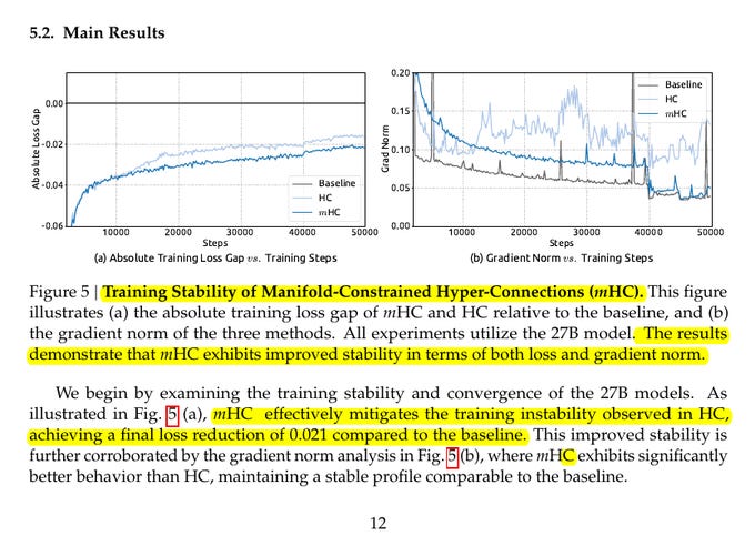 The big win now is that you can try widening the residual stream with Hyper-Connections without betting the whole run on shaky optimization, because mHC is explicitly built to restore the identity-style stability that plain HC breaks.