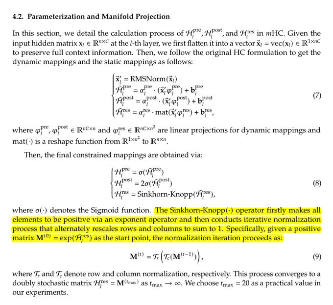 You widen the residual from size C to n×C, treat it as n streams, and learn 3 tiny mixing pieces per layer. One mixes the residual streams with each other, this is the crucial one. One gathers from the streams into the layer. One writes results back to the streams. The paper’s contribution is to keep the first one in the safe “doubly stochastic” set, so it mixes without amplifying.