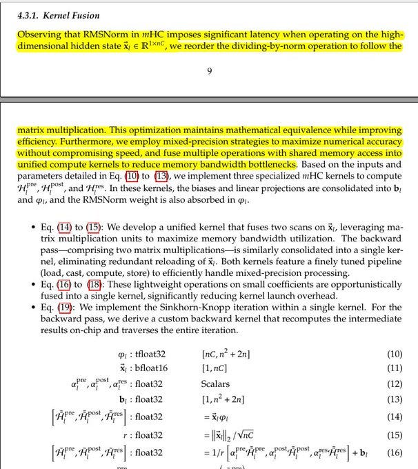 The Sinkhorn-Knopp loop is packed into 1 kernel, and the backward pass recomputes needed intermediates on-chip instead of saving them. A recomputation scheme throws away intermediate activations in the forward pass and re-runs the lightweight mHC kernels during backprop, trading extra compute for lower peak memory.