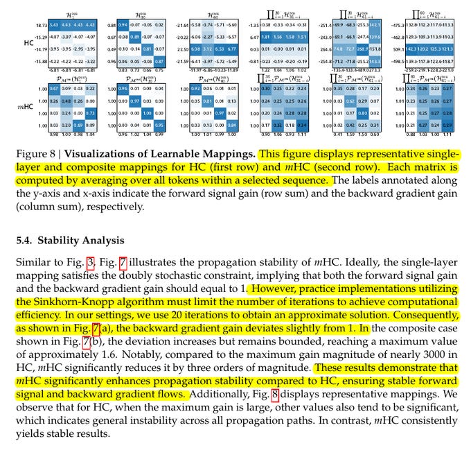 That is a stability jump of about 3 orders of magnitude, while still keeping the cross-stream mixing that made HC attractive. The matrix visualizations back this up, with HC showing large, messy values across many paths, while mHC stays non-negative and looks like controlled mixing.