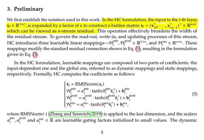 In a normal residual connection, each layer takes the current hidden state, runs a transformation, then adds the original back, so information can flow forward without getting stuck. In this new Hyper-Connections, the layer does not see just 1 hidden state, it sees a small bundle of them, and before the layer it learns how to mix that bundle into the input it will process.