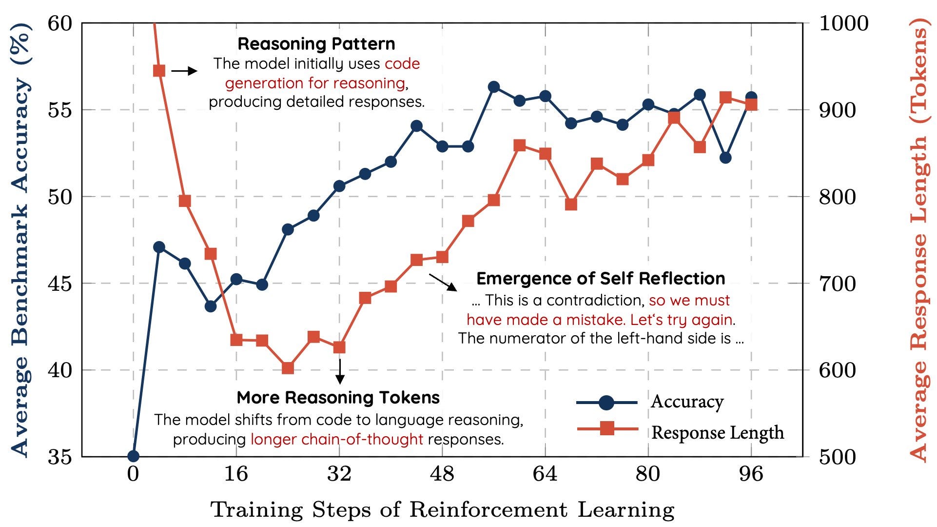 â Emerging Self-Reflection: The model developed "regret-like" behavior, learning to refine and correct its reasoning over training.