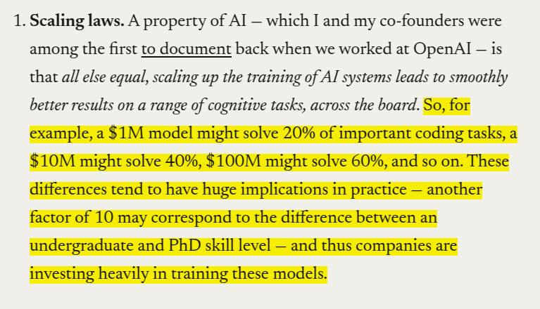 Dario Amodei, CEO of Anthropic publishes a lengthy blog saying that AI race follows predictable scaling laws, and DeepSeek's success aligns with expected cost reduction trends. The real concern is whether China will obtain millions of chips by 2026-2027, potentially shifting global AI leadership. Export controls remain the key mechanism to prevent China from achieving AI parity.