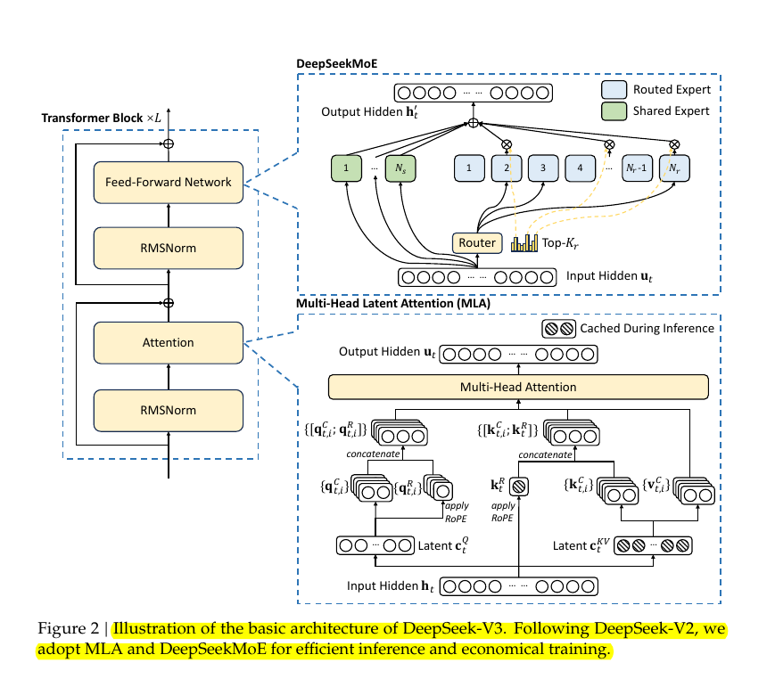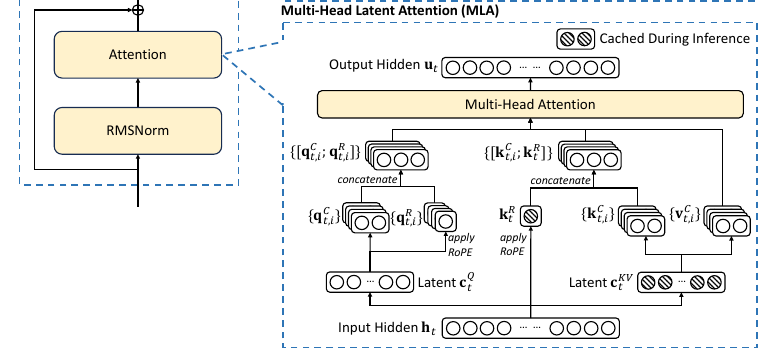 During inference, the system caches certain components (marked with crossed boxes in the diagram) to optimize performance. This caching strategy, combined with the compressed MLA representations, enables DeepSeek-V3 to achieve both high performance and efficient inference despite its large total parameter count.