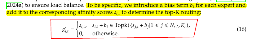 This bias term gets dynamically adjusted during training: decreased when an expert is overloaded and increased when underloaded. The adjustment speed γ serves as a hyperparameter controlling this balancing act. Crucially, while the bias affects routing decisions, the gating value still derives from the original affinity score si,t, preserving model performance.