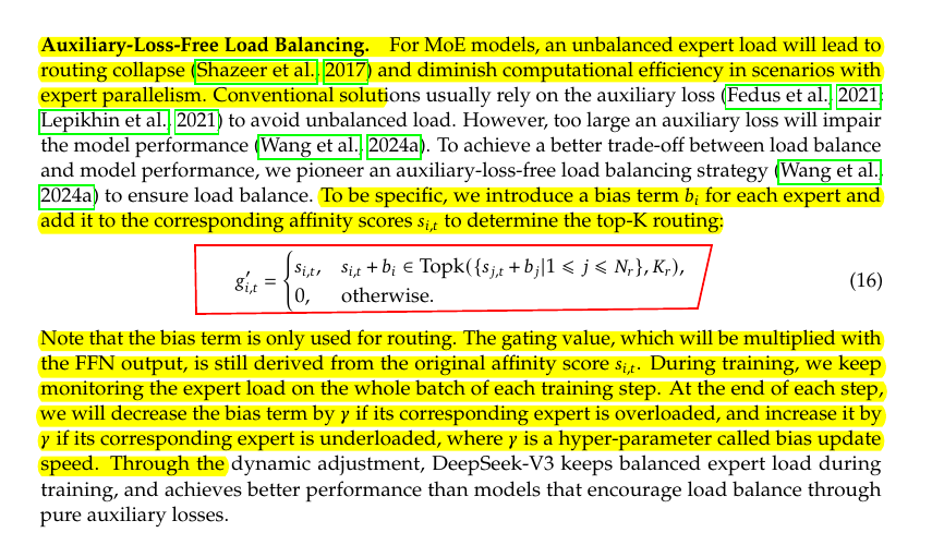 Traditional MoE models use auxiliary losses to prevent routing collapse, but this can hurt model performance. DeepSeek-V3 instead introduces a bias term for each expert, dynamically adjusted during training based on expert utilization. This approach maintains balanced expert load without compromising performance.