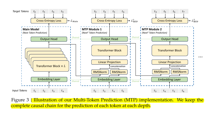 The traditional approach in language models predicts just one token at a time. DeepSeek-V3's MTP mechanism instead implements what they call "lookahead" modules - specialized transformer blocks that attempt to predict multiple future tokens simultaneously. The architecture maintains complete causal chains at each prediction depth, meaning each prediction considers all previous predictions in its context.