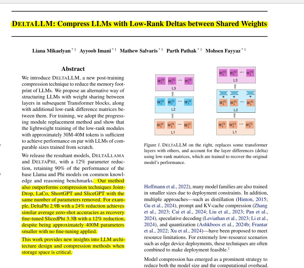 📌 DeltaLLM achieves efficient LLM compression via weight sharing and low-rank deltas. This method reduces parameters significantly while retaining strong benchmark performance with minimal retraining.