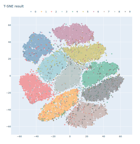 for idx in range(10): fig.add_trace(go.Scatter( x = mnist_tsne_2[:, 0][train_df_org_label==idx], y = mnist_tsne_2[:, 1][train_df_org_label == idx], name=str(idx), opacity=0.6, mode='markers', marker=dict(color=color[idx]) ))