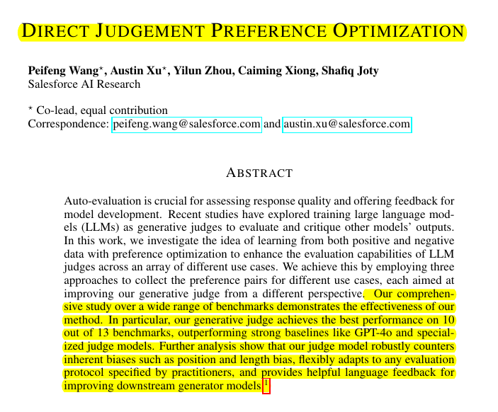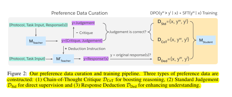Use of preference optimization: Unlike previous methods that rely solely on supervised fine-tuning (SFT), this approach uses direct preference optimization (DPO) to learn from both positive and negative examples. This allows the model to learn what constitutes both good and bad judgements.