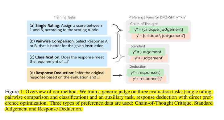 Focus on generative judges: While many previous approaches focused on classifier-based judges, this method trains generative judges capable of providing both numerical scores and free-text critiques.