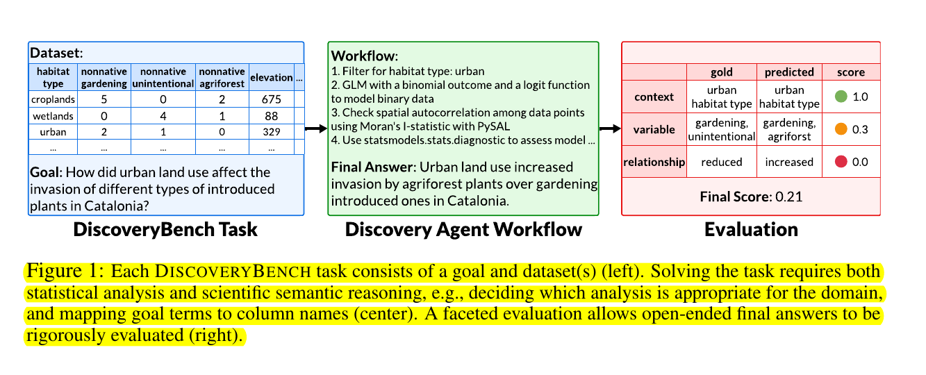 • DISCOVERYBENCH: A benchmark with 264 real-world and 903 synthetic discovery tasks