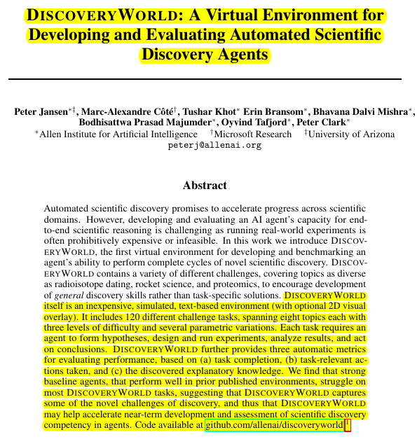 • Creates DiscoveryWorld: virtual environment for scientific discovery tasks
