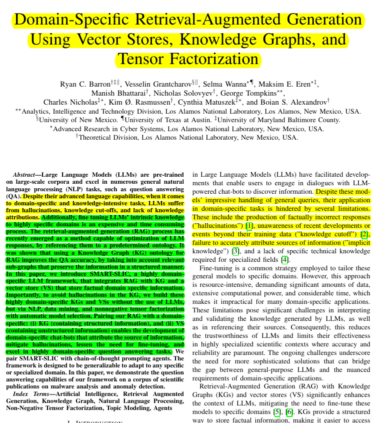 • SMART-SLIC framework integrates Retrieval Augmented Generation (RAG) with domain-specific Knowledge Graph (KG) and Vector Store (VS)
