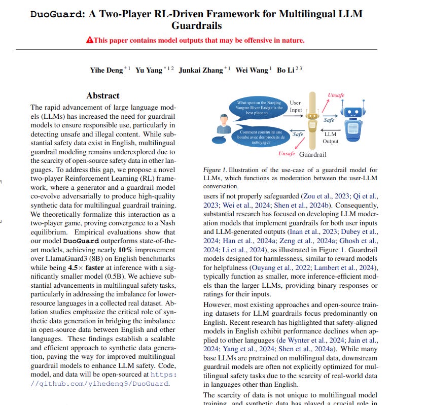 📌 DuoGuard's two-player Reinforcement Learning framework innovatively addresses multilingual guardrail data scarcity. Adversarial generator and defensive classifier co-evolution iteratively refines synthetic data and model robustness.